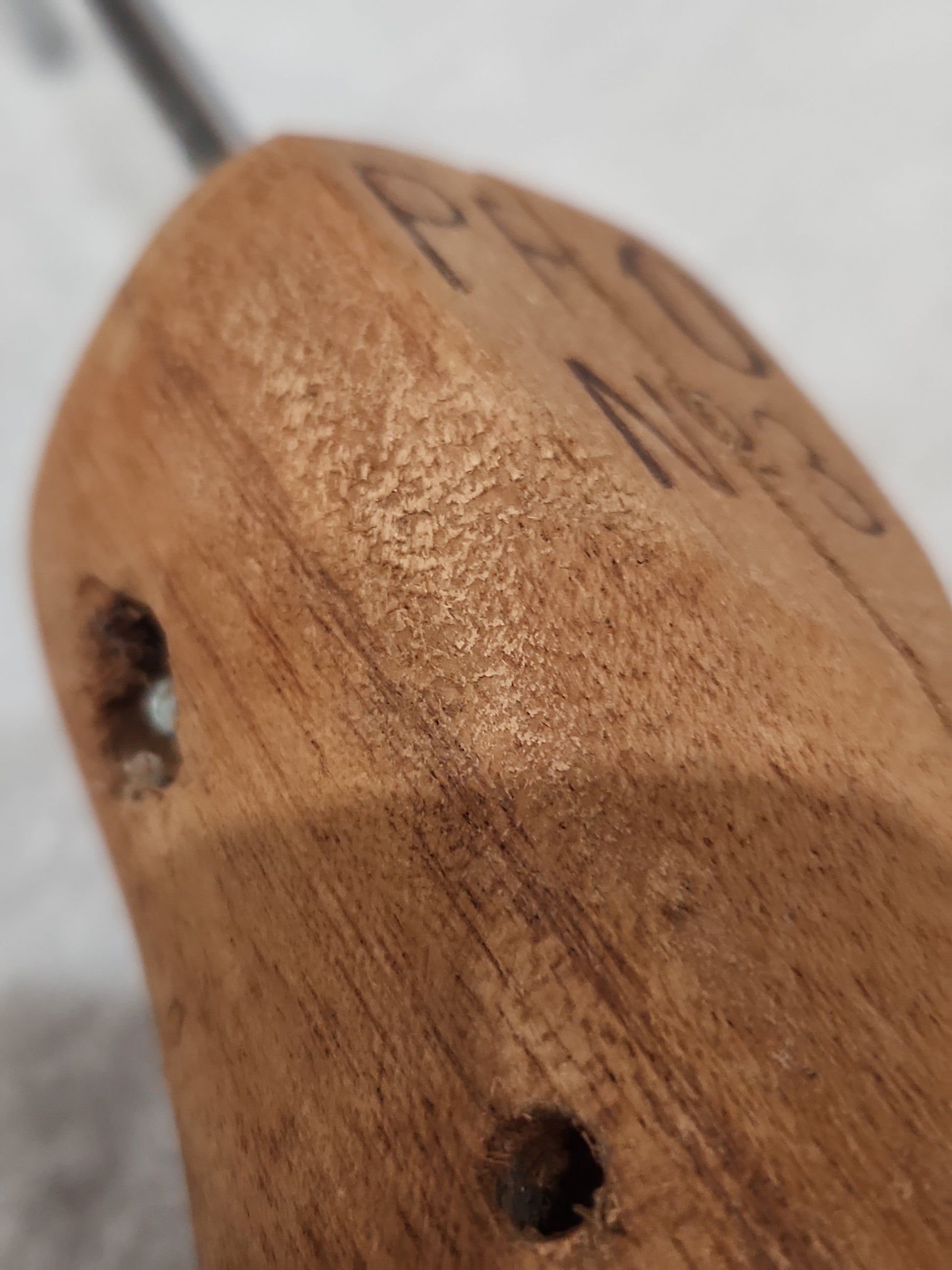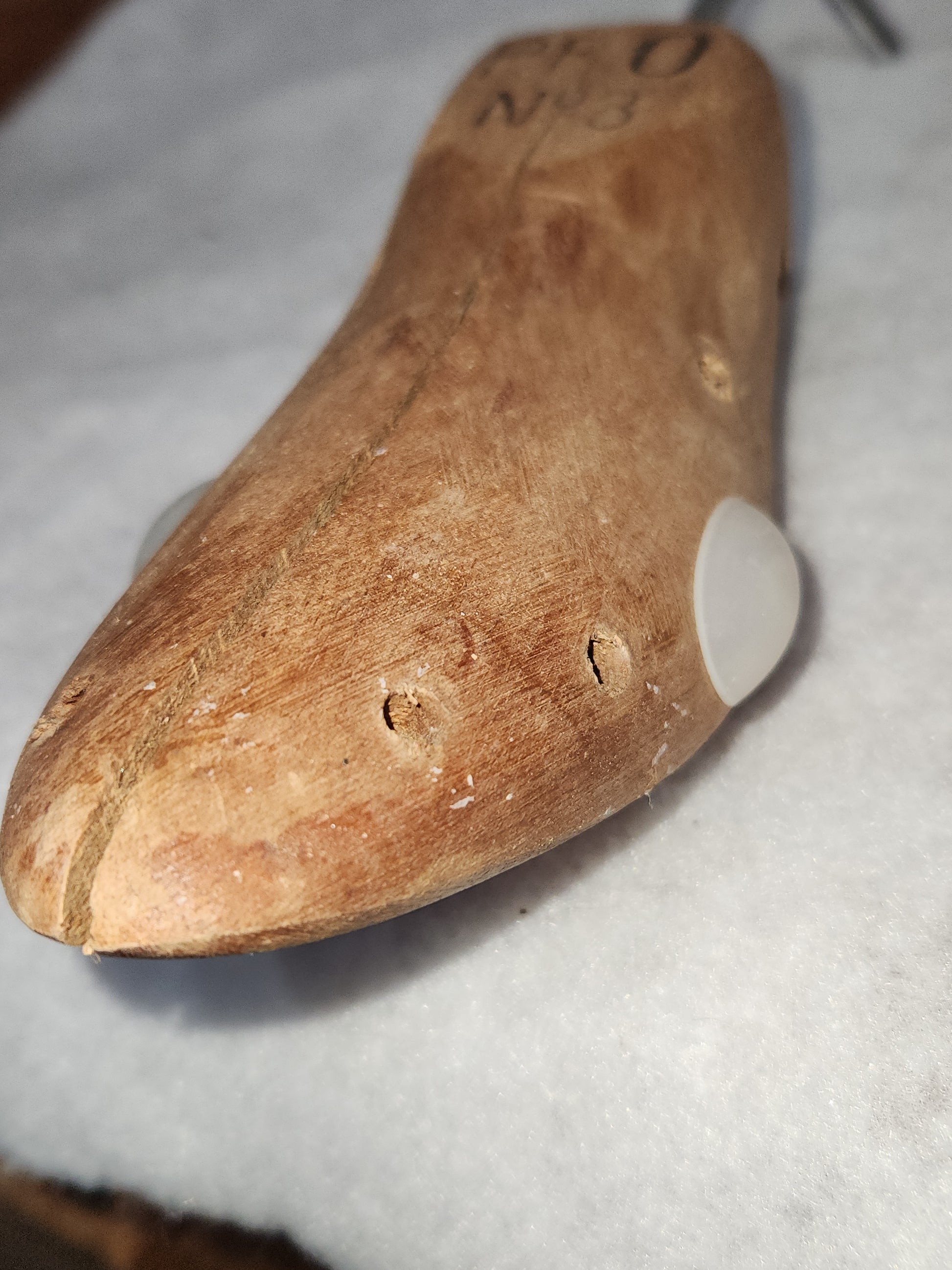 This wooden shoe Stretcher is in fair condition. It has seen some us. There is a lot of wear and loss of varnish. The wooden part is 6 3/4" long and 3 1/4" wide. The metal adds 4 1/4" to the total length. It is stamped PRO No3. Please see photos as they are part of the description.