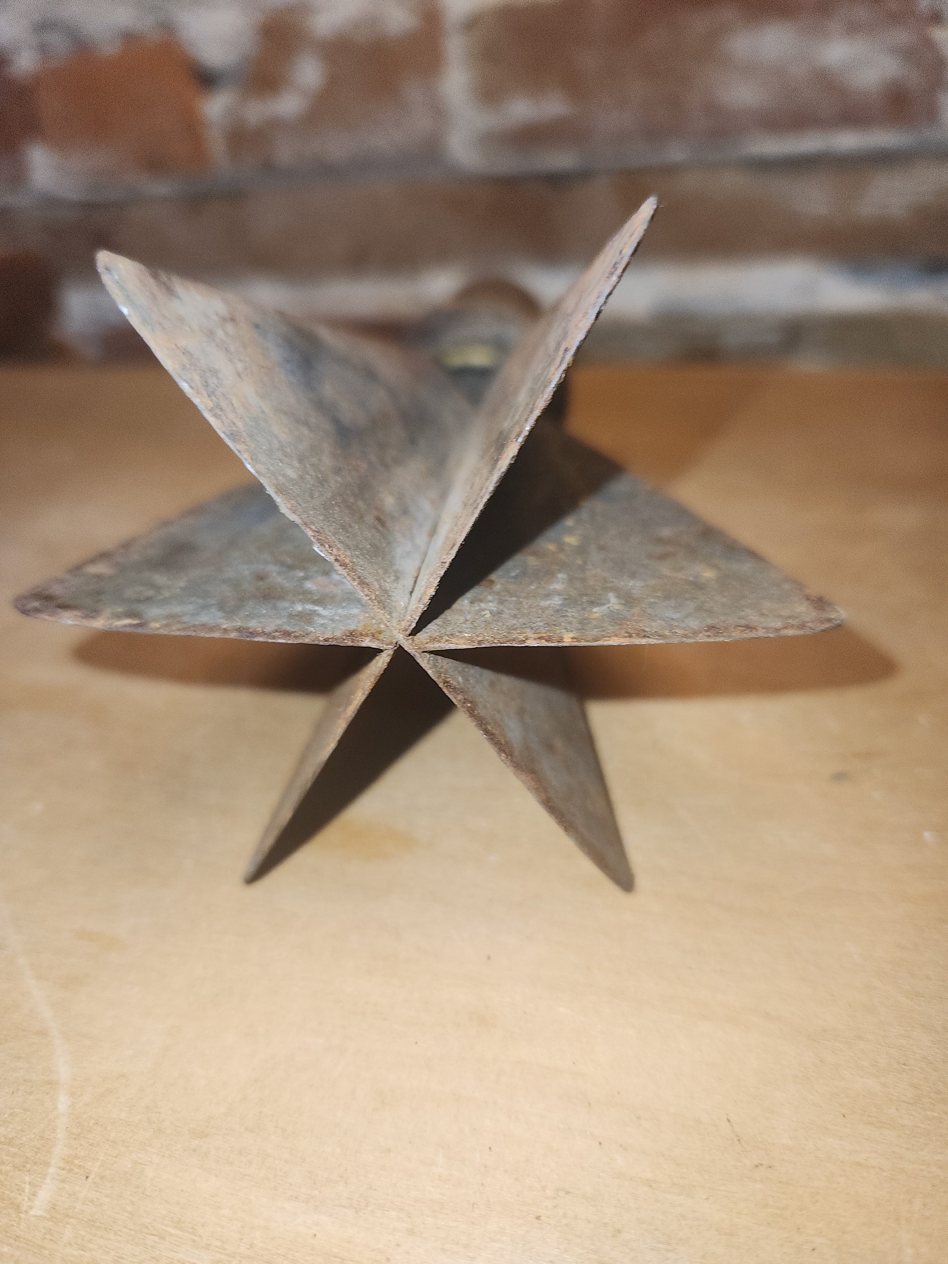 This Chopper has metal blades, a metal color and wooden handle. The edges of the blades are curved to reduce marring the bowl. The handle has some pits near the top. The blades are rusty crusty goodness. It is 9 1/2" tall the diameter of the blades is 3 1/2". Please see photos as they are part of the description