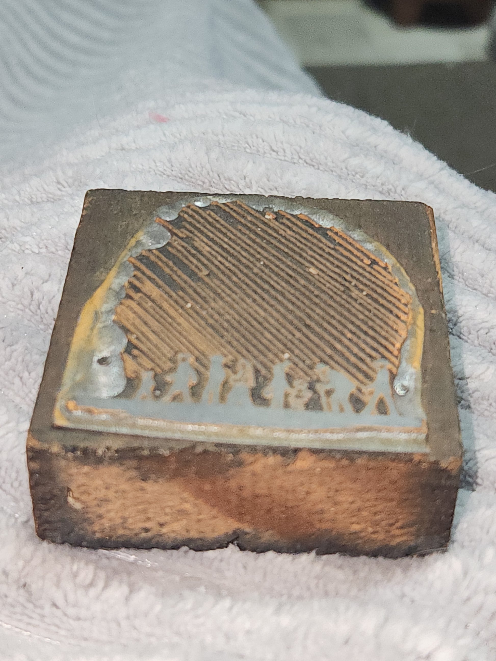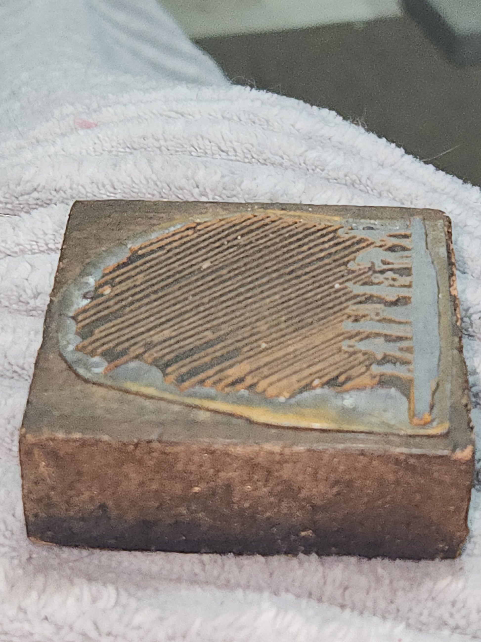 This block is 2 1/2" tall and 2 3/8" wide and 3/4" deep. The stamp is a non-magnetic metal. It looks like People in different stages of life. The block has some ink stains. Please see the photos as they are part of the description