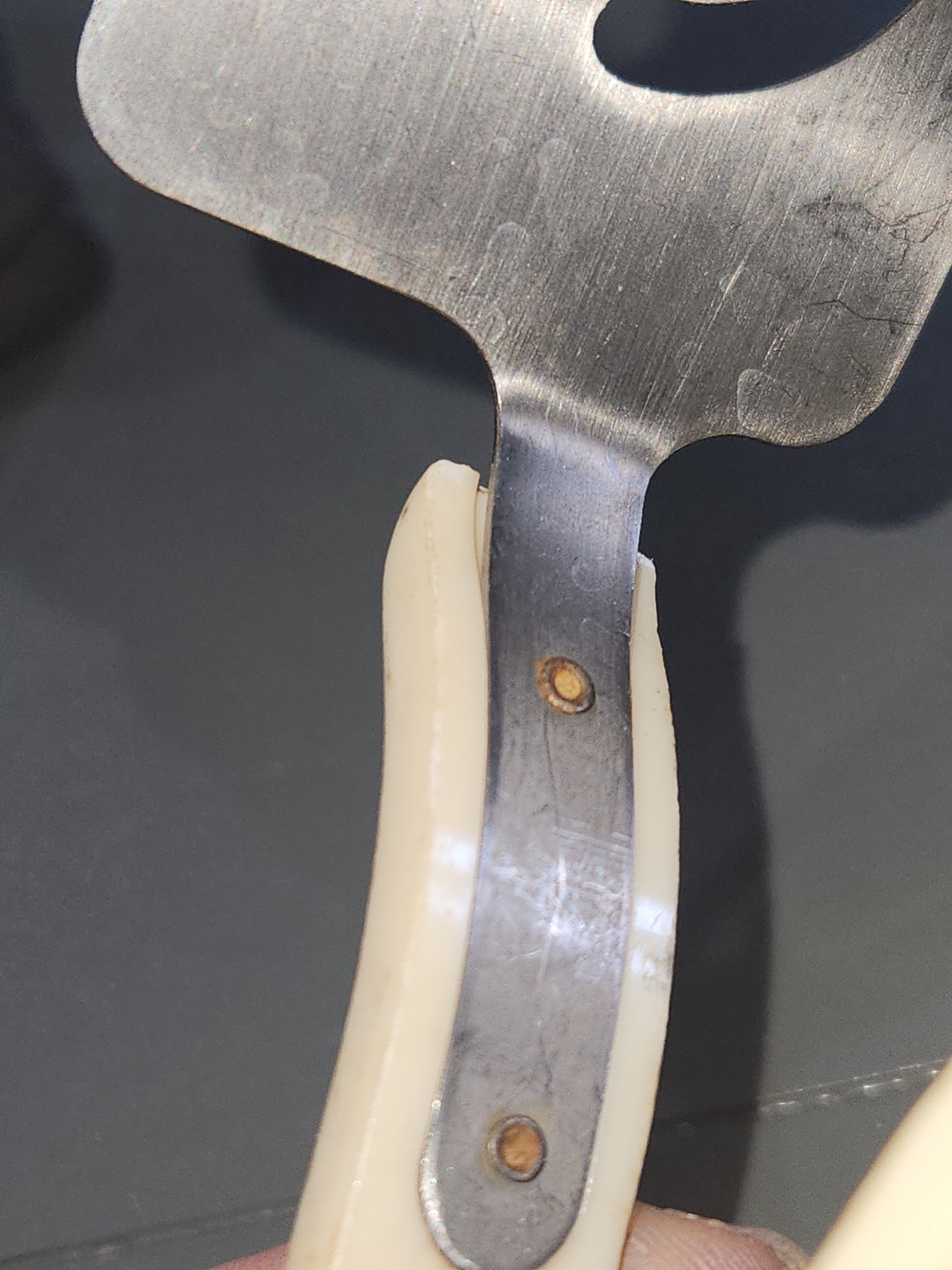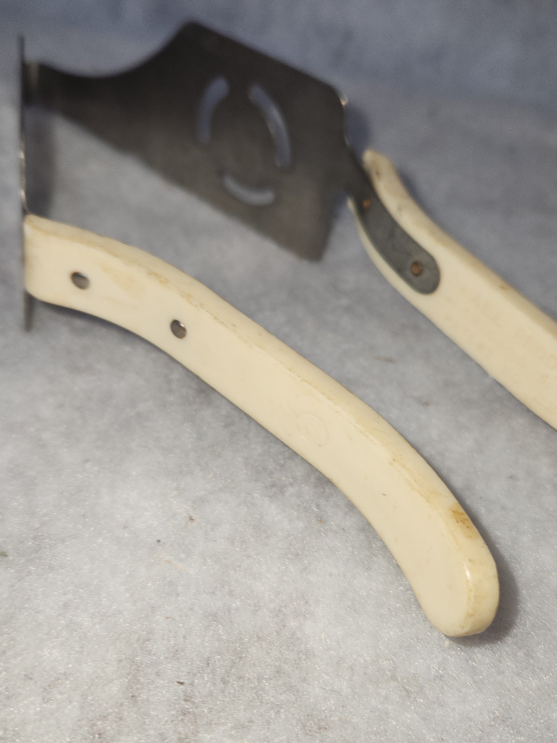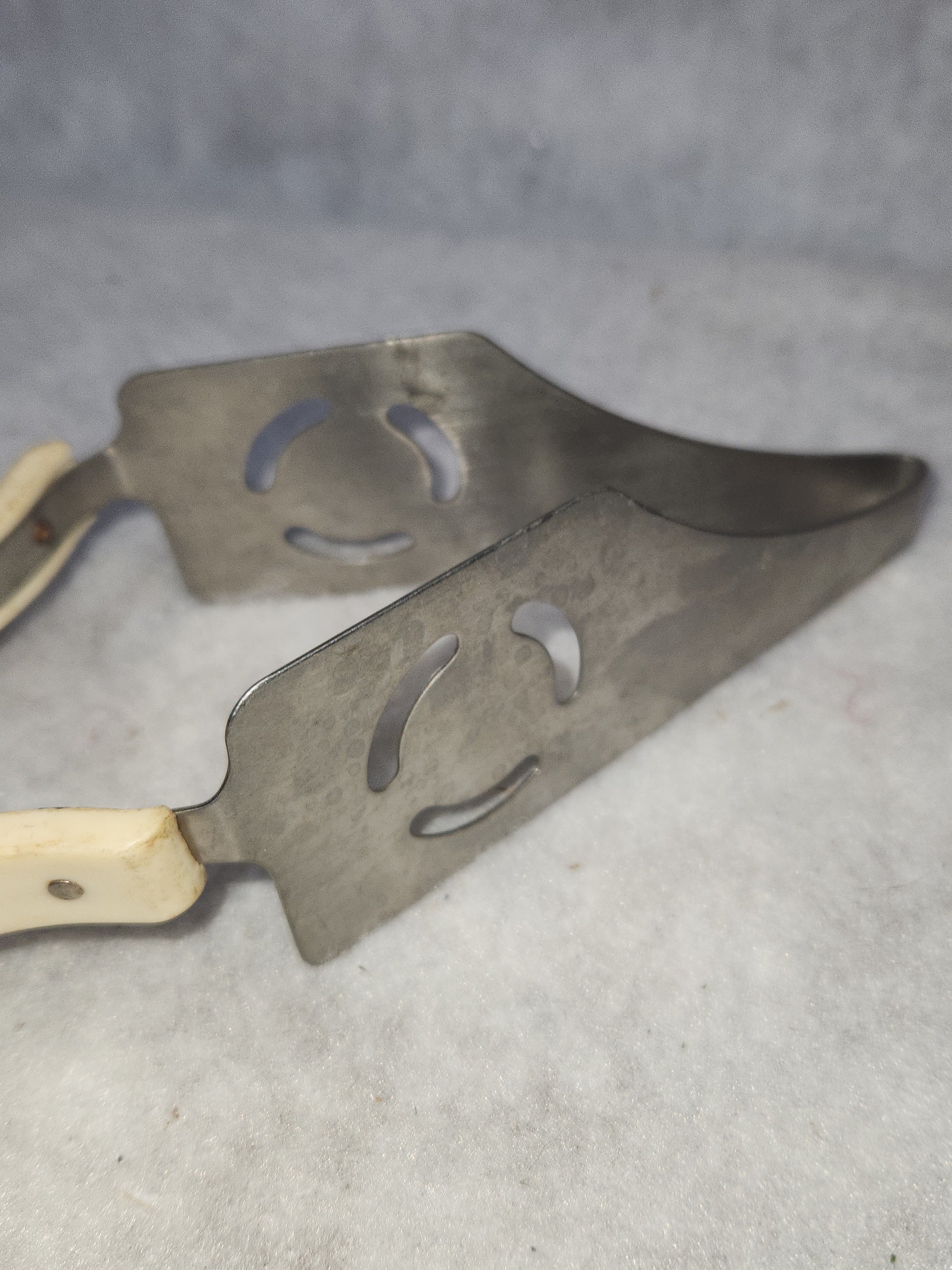 This cake pie server has bake lite handles. They seem to be in good vintage condition. I don't see any cracks or chips in the handles, they do need a good cleaning. The metal part is in good condition, there may be some rust on the screw heads that attach the handle and tongs together. Please see photos well before purchase, they are part of the description.