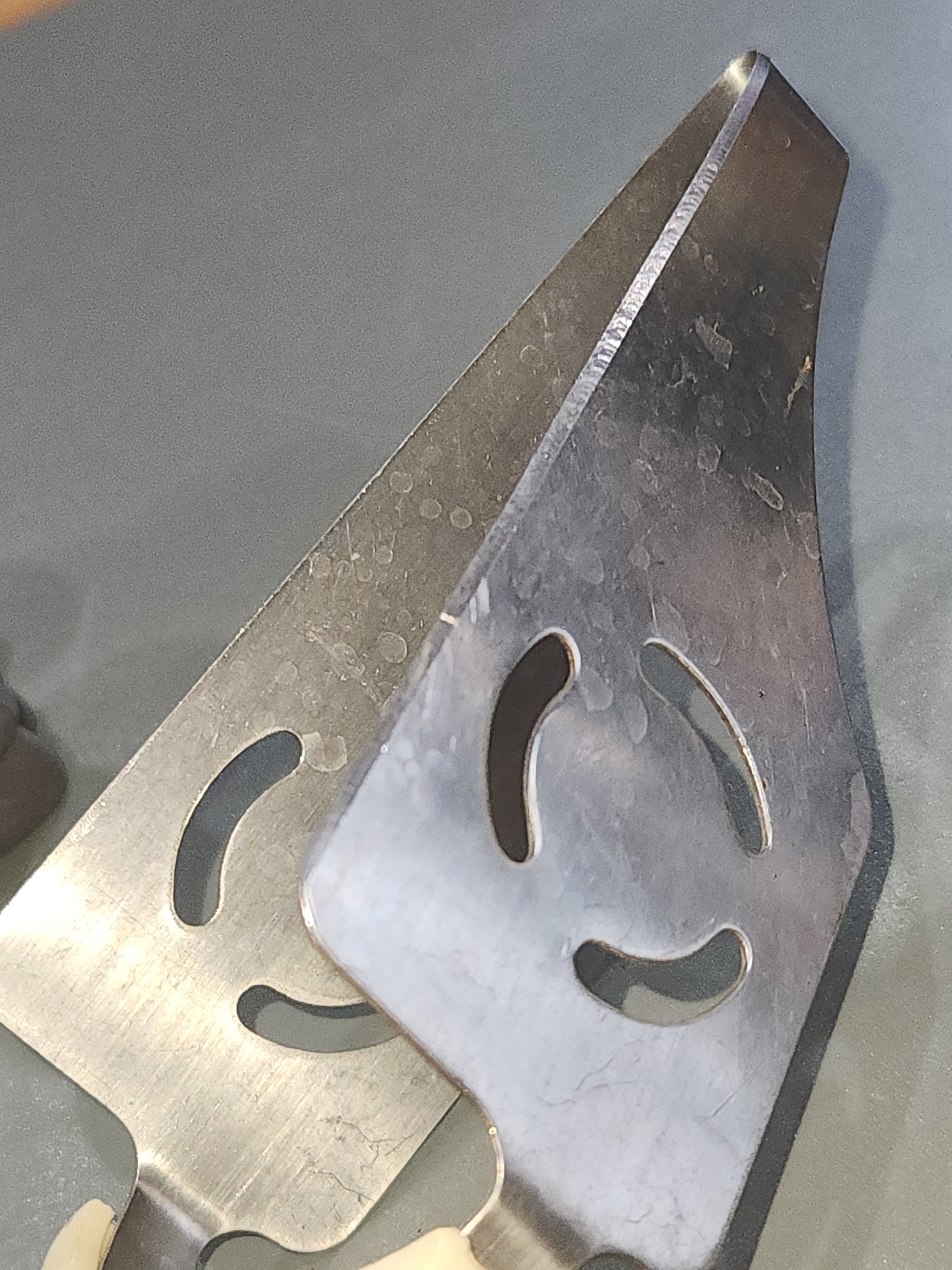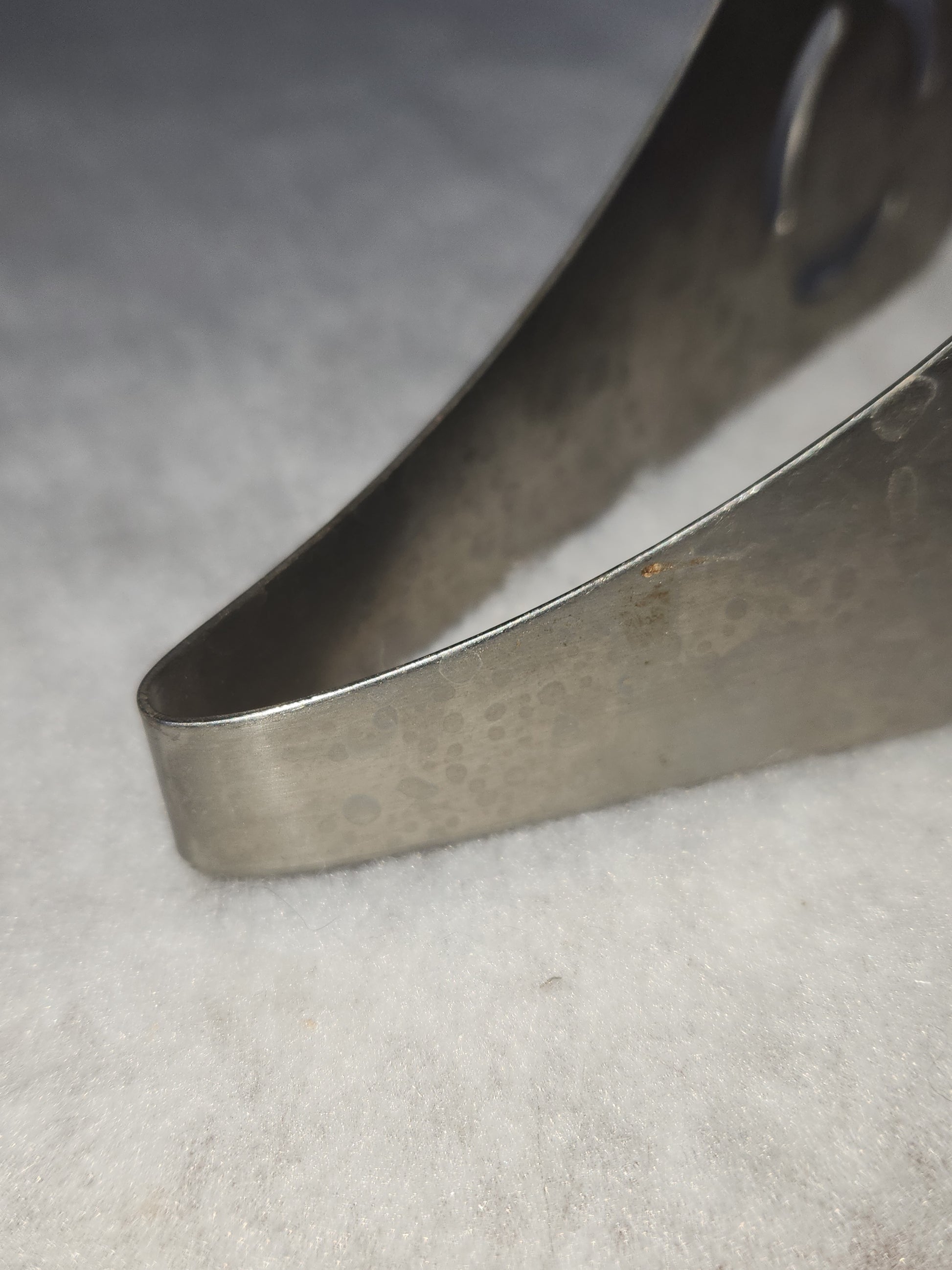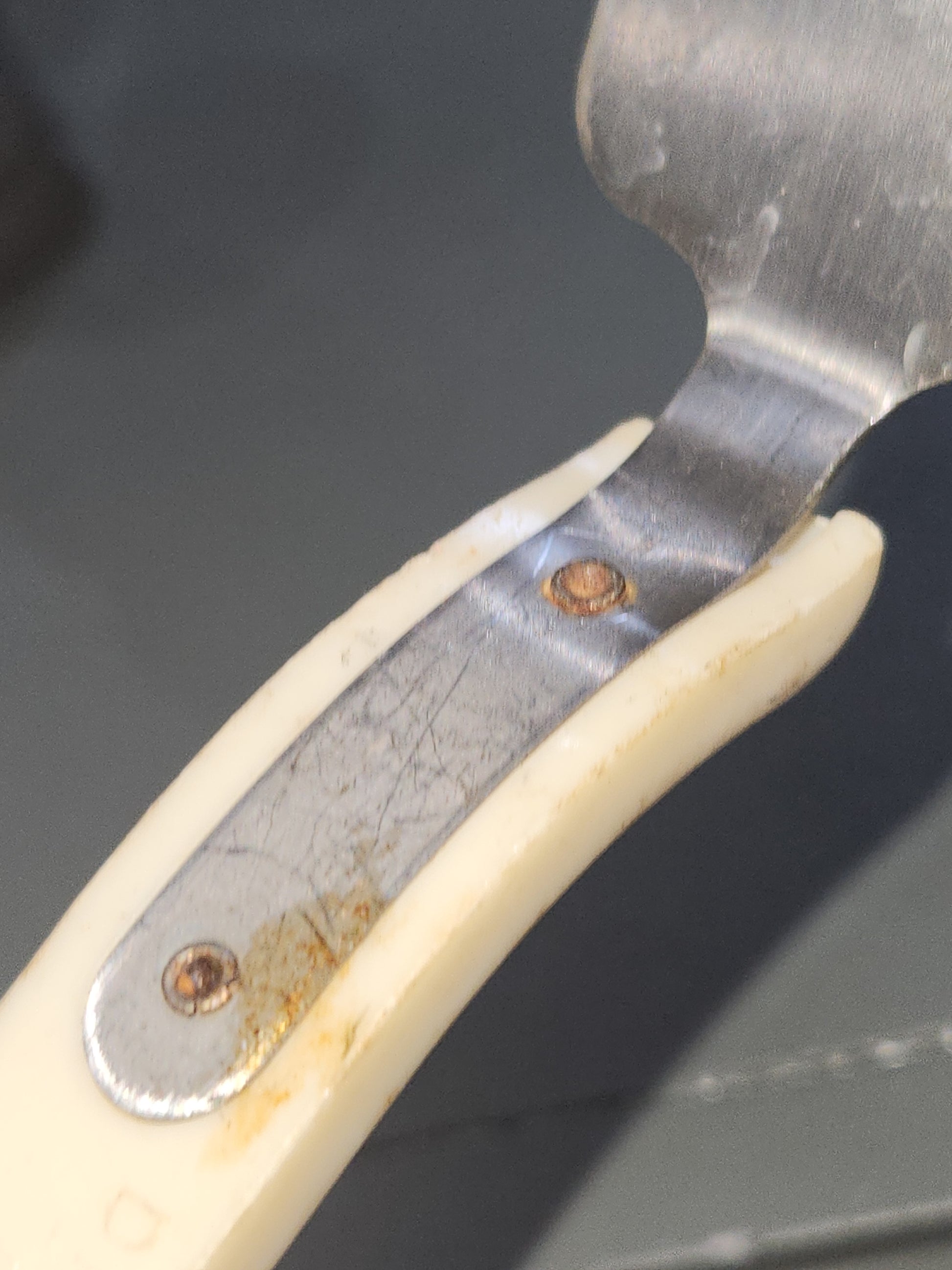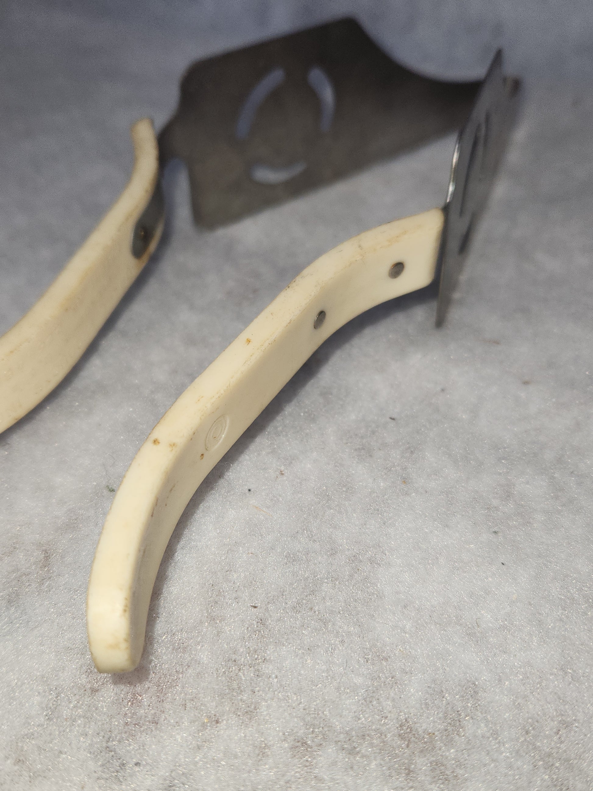 This cake pie server has bake lite handles. They seem to be in good vintage condition. I don't see any cracks or chips in the handles, they do need a good cleaning. The metal part is in good condition, there may be some rust on the screw heads that attach the handle and tongs together. Please see photos well before purchase, they are part of the description.