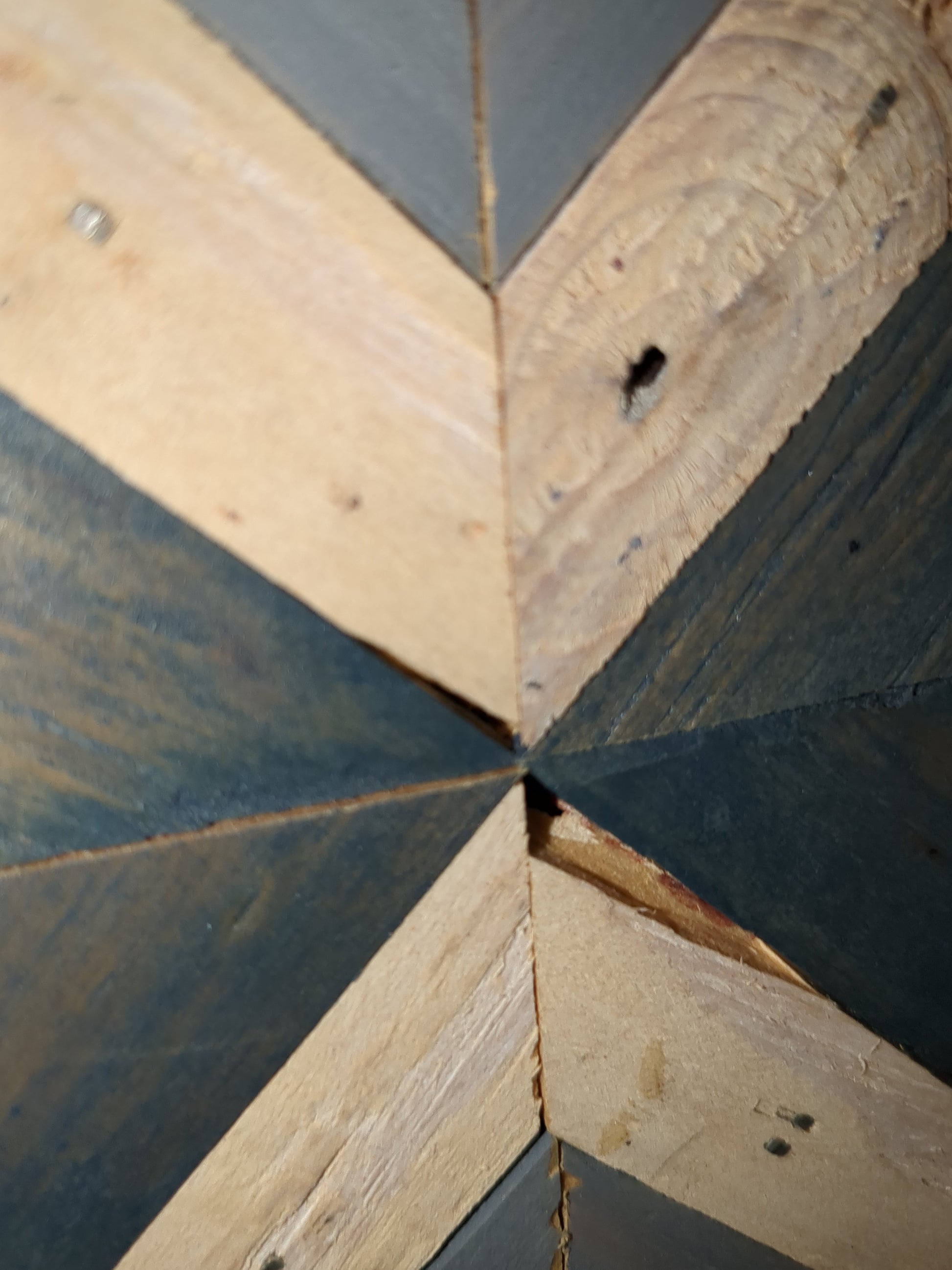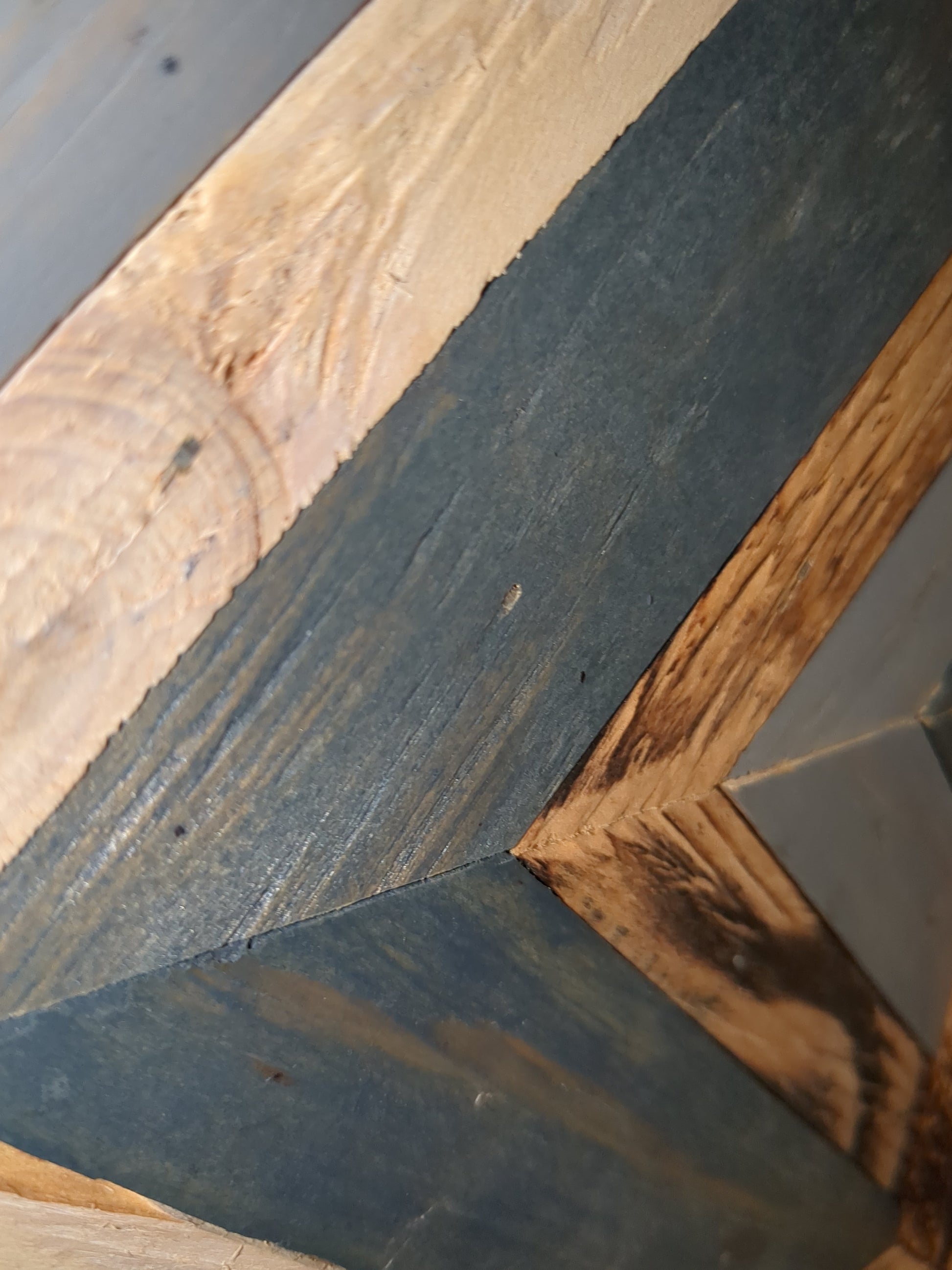 This is made in-house by our son and college student Ian. These are little pieces of wood that he has cut and painted or stained and put together in a frame that he also put together and it's backed with plywood. It's a heavy piece and can easily stand on its own or it can be hung from the hanger on the back. 13" wide 9 1/4" tall and almost 1 1/2" thick. This one does have a few areas that are not perfect, price is adjusted for that.