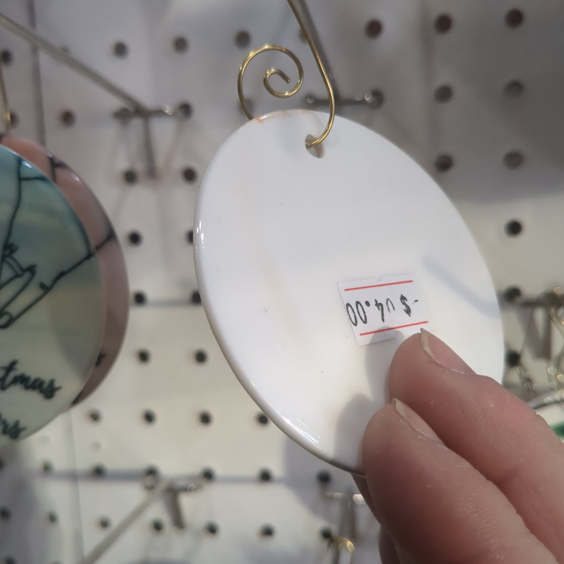 3 inch round ceramic ornament with a couple in a wedding dress in a tux. It does not say anything so can be used for previous years or future